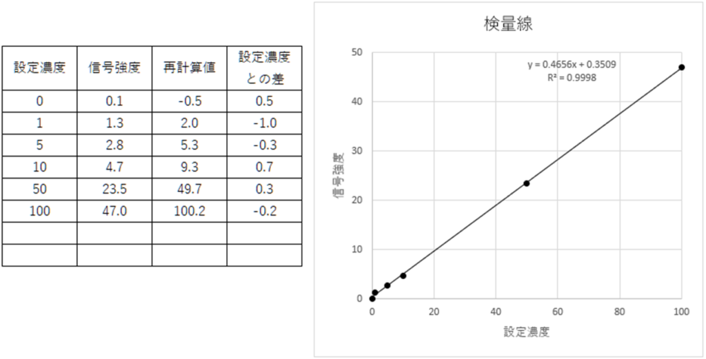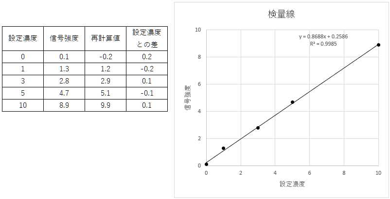 再計算値は検量線「y=0.8688x+0.2586」のxに信号強度を代入した時の値です。